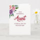 On the front of the card a soft watercolor cluster of flowers and leafy stems sits in the upper-left corner, with pale pink, rose, and lavender petals blending into gentle green foliage. The wide white background feels airy, like a quiet pause that lets the artwork and message speak with a calm, affectionate tone ❤️. Centered on the page, the main word “Aunt” appears large in deep crimson, drawn in flowing letterforms that feel like a warm hug in ink. Just above it, “TO A WONDERFUL” is set in smaller uppercase letters in a warm red, neatly aligned to lead your eye downward. Below “Aunt,” the line “A SPECIAL WISH ON MOTHER’S DAY” continues in the same warm red, using a simple, easy-to-read style that keeps the focus gentle and sincere 🌼. The generous spacing around the text gives everything room to breathe, like a thoughtful note written with care for someone close. The floral painting fades softly at the edges, with the green leaves curling toward the center while the rest of the card stays bright white.