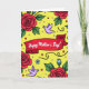 This card features a sunshine-yellow background with a crimson ribbon banner stretched across the center, creating an affectionate, celebratory scene ❤️. In the middle of the banner, white lettering is placed prominently, standing out sharply against the red. Around it, full red roses with strong black outlines bloom like a bouquet offered with care, their layered petals giving a tender, romantic touch. Emerald-green leaves and a few small blue buds fill the spaces between the flowers, adding a fresh, gentle contrast. Soft lavender birds glide across the design with open wings, as if circling close together in a friendly, caring way 🌼. Small red and pale violet dots are scattered like confetti, while thin black swirls curl through the background to guide your eye around the page. The roses, birds, and decorative curls are all edged in black lines that pop against the yellow field.