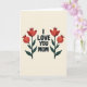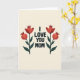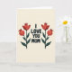 The front design shows dark, sans-serif text reading “I LOVE YOU MOM” centered on a muted cream background, making the message the main focus ❤️. On both sides of the words, two matching botanical drawings create a calm, balanced scene, like a quiet moment of closeness shared between you and her. Each plant has a slim, dark green stem with two crimson shapes: a rounded bloom near the top and a smaller sphere below with a tiny crown-like tip. Soft shading inside the red shapes adds gentle depth, giving them a tender, almost glowing look that feels affectionate without needing extra decoration. The layout stays simple and airy, with plenty of open space around the lettering so the eye lingers on the message. The text sits in the middle while the plants stand like supportive companions, mirroring each other with steady symmetry 🌼. The crimson blossoms show subtle gradients from deeper red at the edges to lighter red toward the center.