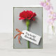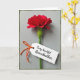 This design shows a single deep red flower with layered, ruffled petals opening outward like a quiet romantic gesture, centered upright on a crisp green stem. A white rectangular tag hangs from the stem at a slight angle, as if it’s been tucked there for someone special ❤️. The message is written on the tag in flowing dark lettering, positioned neatly in the middle with comfortable spacing around it. A small bow of bright orange twine ties the tag to the stem, adding a warm contrast that feels like a friendly wink. Behind everything is a light gray background with subtle vertical texture lines, like fine paper or softly woven fabric. Gentle, diffused light creates soft shadows along the petal folds and the sharp edges of the tag, giving the scene a calm, intimate closeness 🌼. A muted green border frames the image all around, with the flower rising along the center line and the tag resting just to one side.