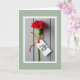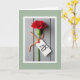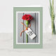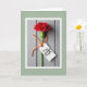 This greeting card features a single deep red flower centered on a sturdy green stem, set against vertically lined, weathered gray wooden boards that feel cozy and familiar. Soft, diffused light falls across the petals and the wood, creating gentle shadows that add depth and a quiet, affectionate mood ❤️. Tied to the stem with a coiled orange string, a small white tag hangs slightly to one side, like a private note shared between close family or friends. The message “To my wonderful Daughter” appears on the tag in a dark, handwritten-style line, standing out clearly against the white surface. The flower’s velvety-looking petals open outward, drawing the eye in as if offering a tender gesture. A crisp white border frames the scene, giving the central image extra focus, while a muted sage-green margin surrounds the border 🌼. The orange string loops tightly near the stem, and the tag’s corners look neat and bright against the gray planks.