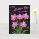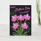 This card features a dramatic inky-black background that makes the floral artwork feel intimate and close, like a quiet moment shared between loved ones ❤️. Along the lower portion, five stylized blossoms spread wide petals with a gradient that shifts from bright fuchsia at the edges to a soft pink-white near the center. Each flower has a deep crimson pouch-like center marked with tiny golden-yellow accents, adding a jewel-like detail that draws your eye. Slender lime-green stems rise from a base of rich emerald leaves, giving the arrangement a grounded, gathered-bouquet look. Curving green tendrils curl and loop around the stems, creating gentle movement that feels like an affectionate embrace. Near the top, the message “Happy Mother’s Day To my Daughter” appears in flowing pink lettering, centered and clearly separated from the flowers below 🌼. The pink text stands out sharply against the dark background, with the words stacked in a balanced layout above the blooms. Fine green curls weave between the upper leaves and the open space beneath the lettering.
