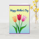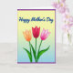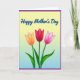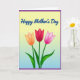 This card features a cheerful Mother’s Day message placed at the top in flowing lettering, set in a dark tone that stands out against the light background ❤️. The layout runs vertically, guiding your eyes down from the words to a trio of stylized flowers arranged beneath. The blossoms look glossy and softly rounded, with petals in warm tangerine, deep crimson, and fuchsia pink that feel like a friendly bouquet offered with care. Slim green stems and small leaves rise upward, as if leaning in toward one another the way close family might. Behind them, the background fades from gentle sunlit yellow near the top to calm sky blue near the bottom, giving the whole scene an airy, open feel 🌼. A rich violet frame surrounds the artwork, keeping the composition neatly contained without crowding the message. The top text sits centered above the flowers, while the three blooms are clustered in the middle with their stems extending downward over the yellow-to-blue gradient.