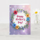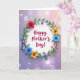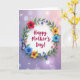 This Mother's Day card features a bright white circle at the center, ringed by a twisting wreath of flowers and leafy stems that feels like a gentle hug ❤️. Inside the circle, the words “Happy Mother’s Day!” sit centered in rich magenta lettering, standing out clearly against the white space. Around it, large blossoms in deep red, calm blue, and warm orange open in layered petals, with shading that makes them look soft and full. Smaller clusters of indigo and coral flowers tuck between the bigger blooms, as if they’re leaning in close like friends sharing a quiet moment. Glossy green leaves with visible veins weave through the wreath, adding a natural frame that guides your eye back to the message. A small butterfly with violet wings and fine dark markings rests along the lower-left curve, adding a light touch of motion 🌼. Behind everything, the background fades from lavender to blush pink with scattered glowing light spots and tiny sparkles across the pastel field.