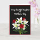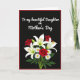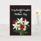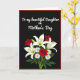 This card features a deep black background framed by a thin crimson border, setting a romantic, intimate tone ❤️. Near the top, a flowing line of white lettering stretches across the upper half, addressed to a mother in a way that feels like a gentle embrace. The bright text stands out sharply against the dark field, leaving generous space below for the artwork to breathe. In the lower half, a bouquet fills the center with white lilies edged with soft green and tipped with golden-orange stamens, like little sparks of affection. Nestled among them are rich red roses with tight, layered petals that suggest closeness and devotion. Small white daisies with sunny yellow centers add a friendly, cheerful touch 🌼, while deep green leaves and slender stems weave everything together. The flowers sit clustered toward the bottom center, with the lilies rising slightly higher than the roses and daisies beneath them. The bouquet shows crisp petals, glossy leaves, and warm yellow centers against the dark backdrop and red border.