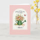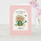 This greeting card features a soft arched frame around a green watering can brimming with flowers, like a sweet gift set down for someone special ❤️. Pink roses, creamy yellow blooms, and small white florets cluster together with fresh green leaves that spill gently over the rim, suggesting a tender, just-picked bouquet. A blush pink background and gentle lighting make the scene feel calm and close, as if shared between friends or partners lingering over a thoughtful surprise. Near the upper right, a small red butterfly floats in midair, adding a quiet sense of motion and a romantic pause in the moment 🌼. Along the base of the watering can, a few loose petals and tiny blossoms rest on the ground, like traces from a recent arrangement. At the top, a short celebratory line appears in a flowing, decorative style in a darker tone that stands out against the pale backdrop. Beneath the illustration, a smaller line of text sits centered in a matching dark color, leaving airy space around the image. The watering can shows subtle texture with gentle shading, and the bouquet fans upward in rounded layers within the arch.