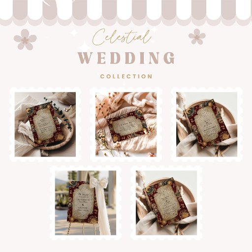 An opulent celestial invitation adorned with deep crimson tones, gilded constellations, and baroque astronomical motifs. Perfect for evening weddings, gothic romance themes, or celestial-inspired celebrations, this design captures the majesty of the cosmos and the timeless elegance of vintage starlight art.