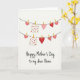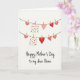 This card shows a soft beige background with two gently curved horizontal lines stretching across the upper area like simple clotheslines. Small golden pegs hold a row of hanging shapes, including hearts in rose and deep red that feel like little notes of affection ❤️. Mixed in are small rectangular cloth pieces, some with red polka dots and one with diagonal stripes, arranged as if someone carefully clipped them up at home. The spacing of the hearts and cloths creates an easy rhythm across the page, like a quiet moment shared between loved ones. Below the hanging garland, the message “Happy Mother’s Day to my dear Nana” sits centered in a flowing, hand-drawn lettering style. The text appears in a dark tone that stands out clearly against the pale background, with the words occupying the lower third of the design. A few of the hearts are a lighter pink, and the tiny pegs have a warm yellow-gold tint 🌼.