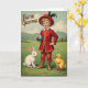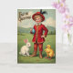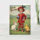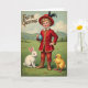 This card features a rosy-cheeked child with bright blue eyes and golden curls standing in the center of a pastoral scene, wearing a deep red coat with gold trim, matching trousers, and sturdy lace-up boots. A wide-brimmed red hat topped with a dark feather tilts slightly, adding a gentle, old-fashioned touch as the child cradles a smooth pastel blue egg close to their chest. To the left sits a white hare with pink ears 🐇, angled toward the child as if listening, while on the right a fluffy yellow chick with pink legs leans in with curious attention. The three figures feel like close companions, their poses and shared focus creating a quiet, affectionate moment in the grass. Behind them, a green lawn leads into rolling hills that fade into a soft sky-blue distance under light, airy clouds. In the upper left corner, the words “EASTER GREETINGS” appear in ornate gold lettering, standing out against the pale sky. Small touches of spring, like a hint of budding greenery and gentle color transitions, keep the scene tender and calm 🌷. The lawn is richly green with fine texture, and the clouds sit like soft white brushstrokes across the blue background.