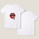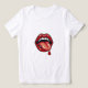 A striking and edgy design featuring glossy red lips with sharp vampire fangs, a curled tongue, and a single, dramatic droplet of blood. This artwork embodies a blend of allure, danger, and gothic mystique