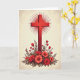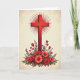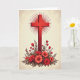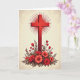 The front design shows a deep crimson cross centered in the upper half, outlined with sharp radiating lines like a glowing halo against a warm parchment-toned background. Beneath it, a dense bed of flowers spreads across the lower portion, with layered blooms in scarlet, vermilion, and soft coral nestled among dark olive-green leaves. Some blossoms are fully open while others are still curled tight, leaning toward each other as if sharing a quiet, close moment 🌷. The greens and reds balance each other, giving the scene a gentle sense of togetherness without needing any figures. Any wording would sit neatly in the open space around the cross, and it would read well in a deep red or dark brown to match the palette. The background has faint, mottled texture like aged paper, keeping the focus on the strong shape above and the living color below 🐇. Fine rays extend outward from the cross, while the floral base forms a rounded, grounded silhouette along the bottom edge.