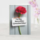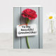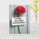 Designed with a tall layout, the card features one large red flower near the top, its many ruffled petals drawing the eye like a tender bouquet offered with care ❤️. A warm yellow-orange cluster of stamens glows at the center, adding a soft golden touch against the deep red. A sturdy green stem runs downward and gently “holds” a white scalloped tag in the middle, giving the scene a quiet, affectionate feel. The tag is tied on with a small knot of bright orange twine, like a thoughtful little keepsake left for someone special 🌼. Centered on the tag, the message “To my beautiful Grandmother” appears in dark, flowing lettering that stands out clearly on the white. The background stays pale and lightly textured with faint vertical grooves, and the lighting is soft enough to show the petal layers without harsh shadows. The orange twine sits just above the tag’s top edge, with the scalloped border crisp against the light backdrop.