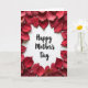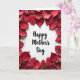 The front design shows “Happy Mother’s Day” centered in dark red lettering on a bright white background, creating a clear focal point. Around the text, dozens of flower petals form a soft border, mostly in deep crimson and ruby tones that suggest affection ❤️. The petals feel gently arranged rather than stiff, curving inward like a caring embrace and loosely hinting at a heart shape. Subtle light and shadow across the petal surfaces add depth, so the reds look layered instead of flat. The open white space in the middle gives the message room to breathe, while the surrounding petals draw the eye back toward the words. The overall look reads like a quiet moment of closeness, as if the border is leaning in protectively around the greeting 🌼. The phrase sits squarely in the center, with the petal frame thickest near the edges and slightly lighter toward the corners.