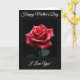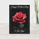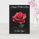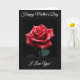 This card features a single deep red flower centered on a dark background, its layered petals curling inward like a quiet embrace ❤️. Soft, focused light falls across the bloom, creating a gentle contrast that makes the red tones feel warm and intimate rather than loud. Tiny water droplets rest on the petals and catch the light like small glass beads, adding a fresh, just-after-rain look. A faint hint of dark green leaves appears near the bottom, grounding the flower without pulling attention away from its tender shape. The main image sits inside a thin, dark rectangular border, surrounded by a wide black margin that keeps the mood calm and close. A short line of white lettering is placed above the framed flower, and another line sits below it, both centered and easy to spot 🌼. The petals show a spiral pattern with glossy droplets scattered across the upper left and mid-right edges of the bloom.