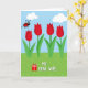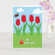 This card shows four tall crimson flowers with pointed petals and green stems rising from a rich green field, lined up like they’re standing together for someone special ❤️. Above them, a bright blue sky holds two soft, rounded white clouds that give the scene an open, airy feel. In the upper left, a small red-and-black spotted insect with thin antennae drifts along, its light trail suggesting a gentle, flirty glide. Near the lower left, a red gift box rests on the grass, wrapped neatly with a white bow as if it’s waiting to be picked up. The words “MY DEAR WIFE” appear close to the gift in dark lettering, set so your eye moves from the present to the message. The simple shapes and flat colors keep everything easy to read while still showing a tender, affectionate moment in a quiet outdoor setting 🌼. The gift sits on the left side of the green ground, with the message placed just beside it in the lower portion of the card.