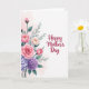 Designed with a soft, romantic floral illustration, this card features a full bouquet running down the left side like a gentle garden border. Large roses in pale and mid pink open toward the viewer, their layered petals suggesting a tender, affectionate moment ❤️. Smaller rosebuds nestle between them, adding a sweet, just-blooming touch that feels like a quiet friendship growing over time. Below, rounded clusters of lavender and deep violet flowers bring a cozy contrast, framed by winding green leaves and slim stems that guide the eye upward. The background fades in a light wash of blush pink with hints of airy blue, giving the scene a calm, dreamy setting. On the right side, the message “Happy Mother’s Day” appears in flowing crimson lettering, centered vertically and standing out clearly against the pale backdrop 🌼. The bouquet’s greens and purples deepen near the bottom edge, with a few leaves reaching slightly toward the text area.