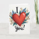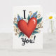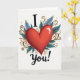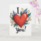 This greeting card shows a big, rounded red heart in the middle with a small shiny highlight that makes it look slightly glossy. ” Deep teal leaves and small cerulean-blue flowers surround the heart, with little golden-yellow accents tucked in between. Dark brown curling vines and a few golden spiral details frame the design like gentle scrollwork. Tiny golden dots are scattered around the white background, adding a soft sparkle without taking attention away from the heart. It feels meaningful to give because the simple message and the careful details both say “you matter to me” in a clear, caring way 🥰.