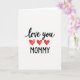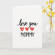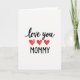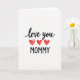This greeting card features a bright white background that keeps the focus on a simple, loving message. Near the top, the words “love you” appear in a flowing black cursive style, like a quick note written with care. Just beneath it sit three red watercolor hearts, slightly different in shade and texture, leaning together like close companions ❤️. The soft, feathered edges and light-to-dark paint pooling give the hearts a tender, intimate look, as if they were brushed on in a quiet moment. Lower on the page, “MOMMY” is set in strong black uppercase letters, centered and spaced to feel steady and reassuring. The contrast between the smooth cursive above and the firm lettering below creates a gentle balance between affection and support 🌼. The three hearts are arranged in a neat row between the top line of text and the centered “MOMMY” beneath.