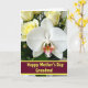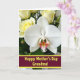 This card shows a close-up floral portrait centered on a white orchid, its wide petals softly lit so they look almost translucent and gently veined. Near the flower’s throat, fuchsia, sunny yellow, and warm orange gather in an intricate pattern that draws the eye inward like a tender secret shared between friends ❤️. Behind it, creamy yellow roses sit slightly out of focus, with a mix of tight buds and partially opened blooms that add depth and a cozy, affectionate feel. Deep green leaves frame the lighter flowers, giving the arrangement a calm, romantic balance without feeling busy. Along the bottom, a rich crimson band stretches across the design, and a short line of gold text sits centered on that band, standing out clearly. A small orchid bud appears nearby, suggesting another bloom on the way, like a quiet nod to growing care 🌼. The background stays dark and soft, while the orchid’s bright center and the golden lettering catch the light against the crimson strip.