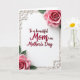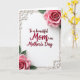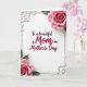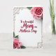 This design shows a white rectangular card with a calm, neutral backdrop and a loving message centered like a quiet note ❤️. In the middle, flowing red lettering reads “To a beautiful Mom on Mother’s Day,” standing out clearly against the light background. Two full blossoms with many soft pink petals sit in the upper right and lower left corners, as if leaning in toward the words with gentle affection. Bright green leaves cradle each flower, adding a fresh contrast that keeps the scene warm and friendly 🌼. The other corners include raised white ornamental swirls that resemble delicate lace or piped icing, giving the surface a tender, cared-for look. Soft, diffused lighting creates small shadows around the flowers and raised details, making the textures feel close and touchable. The red text stays centered while the corner decorations frame it evenly, leaving clean space around the message. The upper right bloom shows layered pastel-pink petals with a cluster of green leaves tucked beneath it.