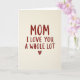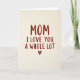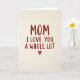 This greeting card features a soft, creamy off‑white background with a gentle paper-like texture that feels like a note meant for someone close ❤️. Centered near the top, the large word “MOM” is written in deep crimson with slightly uneven, hand-drawn lettering that looks like it came straight from the heart. Beneath it, “I LOVE YOU” appears in smaller, simple uppercase letters in the same rich red, keeping the message clear and intimate. A third line, “A WHOLE LOT,” sits just below, also centered, continuing the warm, close-to-you tone like a quiet hug in written form 🌼. The generous empty space around the words makes the message feel focused, like a tender pause between two people who care about each other. The red text stands out strongly against the muted background without feeling harsh, giving the design a calm, affectionate balance. Under the last line, a small heart outline is sketched in red, slightly off-center, with a charming imperfect curve.