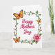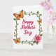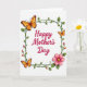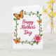 This greeting card features a warm “Happy Mother’s Day” message in deep crimson lettering centered on a bright white background, setting an affectionate tone ❤️. A thin, square border of curling green vines frames the words, with small leaves and tiny buds that feel like a gentle springtime embrace. Around the frame, three butterflies add a soft, friendly energy, their wings fading from golden orange into rich brown as if they’re drifting close together. One butterfly sits near the top-left corner, another balances it at the bottom-left, and a smaller one hovers at the top-right, giving the layout a tender, companionable rhythm. In the bottom-right corner, a layered pink flower with a sunny yellow center leans in toward the border like a quiet gesture of care 🌼. The main text stays centered while the botanical frame and butterflies keep to the edges, leaving plenty of white space for a calm, airy look. Light shading beneath the vines, butterflies, and flower adds gentle depth without making the design feel heavy. The crimson greeting sits inside the green vine square, with the pink flower anchored at the lower-right edge and the smallest butterfly positioned near the upper-right corner.