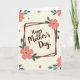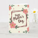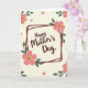This card features a deep reddish-brown message reading “Happy Mother’s Day” placed right in the center, with the letters flowing in a calligraphy-style look that feels gentle and affectionate ❤️. The words sit inside an angular, lightly geometric frame drawn in the same rich color, giving the middle a neat focal point while still feeling warm. Around the frame, stylized flowers and leaves lean inward as if they’re gathering close, adding a friendly, caring mood. The background is a soft creamy tone that keeps everything calm and easy on the eyes. Larger four-petaled blooms in coral-pink with sunny yellow centers are spaced around the border, suggesting a sweet closeness like a bouquet offered with a quiet smile 🌼. Deep green foliage curls and overlaps near the frame edges, softening the straight lines with natural shapes. Smaller pink star-like blossoms are sprinkled in the open spaces, and the reddish-brown border forms a tilted rectangle around the centered text.