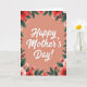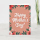 This greeting card features a tall layout with a soft coral background that feels like a warm hug ❤️. In the center, the words “Happy Mother’s Day!” appear in bright white lettering with a faint shadow, making the message stand out clearly. The text sits evenly in the middle, leaving comfortable space around it so the design can breathe. A floral frame wraps around the edges, with blooms gathered most heavily in the corners like a bouquet being offered with care. Deep red and coral flowers mix with pale pink and white petals, and several blossoms have warm yellow-brown centers that add a gentle, affectionate look. Emerald green leaves and a few darker, burgundy-toned sprigs weave between the flowers, giving the border depth and a fresh spring feel 🌼. The flowers appear softly painted, with smooth shading that suggests layered petals and velvety leaves. The corners show the densest clusters of blossoms and foliage, tapering into lighter sprigs along the sides.