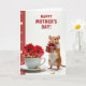 This card features a small furry rodent on the right, with soft brown-and-white fur and bright, attentive eyes, holding a neatly wrapped gift as if offering it with quiet affection ❤️. On the left, a glossy white teacup sits on a matching saucer, filled with two deep red blossoms that lean outward like they’re reaching toward the little creature. The background stays white and airy, letting the reds and warm browns stand out while keeping the scene gentle and calm. Along the far left edge, a tall red banner runs vertically, decorated with small white geometric shapes that add structure without crowding the illustration. Near the top center, the message “HAPPY MOTHER’S DAY!” appears in uppercase red lettering, spaced clearly above the main objects. A few golden-brown paper shreds rest near the bottom, hinting at a recently unwrapped present and adding a cozy, thoughtful touch 🌼. The red ribbon on the gift mirrors the flower petals, and the cup’s smooth highlights contrast with the rodent’s fine whiskers and soft fur texture. The rodent stands slightly angled toward the cup, and the two red flowers rise from the teacup with dark centers and velvety petals.