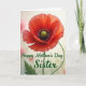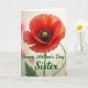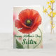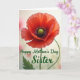 This card features one large poppy-like flower filling the scene, with scarlet-to-crimson petals that look softly translucent, as if lit from within ❤️. The petals show gentle folds and wavy edges, giving the bloom a tender, affectionate presence like a warm hug shared between close friends. At the center, a bright yellow-green pistil is surrounded by a dark ring of nearly black stamens dotted with tiny golden tips. A curving green stem and one serrated leaf sit lower in the design, grounding the flower without distracting from it. The background is softly blurred in creamy tones with a hint of pale rose, creating a calm, romantic glow around the bloom 🌼. Across the upper area, the message “Happy Mother’s Day Sister” appears in deep green lettering, placed over the lighter backdrop for easy reading. The lighting stays gentle and diffused, highlighting the velvety texture along the petal edges and the rich contrast in the flower’s center. The bloom’s core is sharply detailed against the hazy cream-and-rose background, with the single green leaf angled slightly outward beneath it.