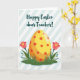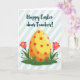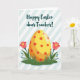 Designed with a springtime scene, the card centers on a large oval shape in bright yellow that softly shifts to warm orange near the bottom, like a decorated egg waiting to be found 🐰. Across its surface, scattered red circles add a cheerful pattern that feels like little shared secrets between friends. The egg sits on a green strip of stylized grass, where two coral-pink flowers rise on thin stems, each with a sunny yellow center that seems to lean in with gentle affection 🌷. Small turquoise buds dot the greenery, adding tiny notes of fresh growth around the base. Behind everything, wide diagonal stripes alternate between white and a light sky blue, keeping the background airy and calm. Near the top, a short greeting is placed above the illustration in deep teal lettering with smooth, flowing strokes. The composition is simple and modern, with soft color transitions on the egg and crisp edges on the stripes and grass. Two coral-pink blossoms with yellow centers stand on either side of the egg, with turquoise buds tucked into the green grass below.