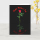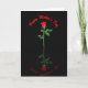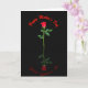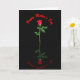 This design shows a single deep red rose rising on a long, slender green stem against a rich black background, like a quiet moment shared between two close hearts ❤️. The petals open softly at the top, and the flower stands alone in the center, giving it an intimate, almost private feel. Beneath it, a mirror-like reflection repeats the rose upside down, as if the bloom is leaning toward its own twin in a gentle, romantic glance. The reflection continues the stem downward until it meets the inverted flower, suggesting a calm surface that holds the image steady. Curving above the real rose is a short greeting in red lettering, placed in an arc that follows the shape of the bloom. A faint reversed version of the same red text appears below, aligned with the reflected rose to echo the curve and create a balanced circle-like layout 🌼. The strong contrast of red and green against black keeps the focus tightly on the flower and its mirrored partner. The red rose and its reflection sit over a glossy dark strip that looks like still water.