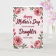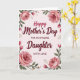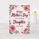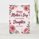 Designed with a soft pink background, this card features a centered Mother’s Day message framed by a gentle floral border that feels like a warm embrace ❤️. The main line “Happy Mother’s Day” sits near the top in deep crimson, followed by “FOR AN AMAZING Daughter” in the middle, with “Daughter” also highlighted in the same rich red for extra emphasis. Smaller connecting words like “FOR AN AMAZING” and “WITH LOVE” appear in a simpler dark tone, keeping the layout easy to read while still feeling affectionate. In each corner, a large pink rose-like bloom opens with petals that fade from deeper rose at the center to a pale blush at the edges, creating a tender, romantic look. Thin, winding branches link the corners, dotted with glossy green leaves and small buds that suggest something lovingly cared for. Tiny berry-like accents in bright red and soft yellow add little sparks of color among the greenery 🌼. The border forms an even frame around the text, with the blossoms anchored at all four corners and the delicate branches curling lightly along the edges.