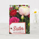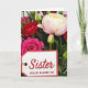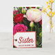 This card shows a close-up bouquet filling the frame, with layered flowers and glossy green leaves creating a cozy, affectionate scene ❤️. In the lower left sits a white gift tag outlined with a thin red border, tied on with a bit of twine like a small keepsake tucked into the blooms. The main word “Sister” is placed near the top of the tag in deep red lettering, and beneath it, “WITH LOVE ON MOTHER’S DAY” appears in smaller red text. A large creamy white flower takes center space, its outer petals brushed with the faintest pink as if leaning in gently toward the tag. Nearby, a deep fuchsia bloom with tightly packed petals and a rich crimson flower sit side by side, like close companions sharing the spotlight 🌼. Small green buds peek out between broad emerald leaves, adding the sense of something quietly growing around the message. Soft, even light highlights the petal textures, the red edging on the tag, and the twine loop resting against the leaves.