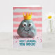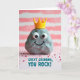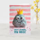 Designed with a friendly, stone-like character at the center, this card features a textured gray figure with bright white eyes and a small, upturned smile that feels warmly inviting ❤️. A tiny yellow crown rests on its head, adding a sweet touch of admiration, like a little nod between close friends. Behind it, wide horizontal stripes in soft pink and white are gently blurred, creating a cozy, dreamy setting. Scattered across the lower area are many tiny crimson-pink sprinkle shapes that resemble confetti, bringing in a festive, affectionate energy 🌼. The lighting is soft and diffused, giving the whole scene a tender glow and making the pastel tones feel calm and comforting. Near the bottom, a short message appears in teal lettering, centered and easy to read against the lighter background. The crown is a smooth, bright yellow shape with simple points, sitting neatly above the character’s wide eyes.