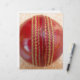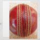 The artwork features a tightly cropped view of a red leather cricket ball. The focus is sharp on the central seam and the surrounding leather, showcasing the detailed stitching and the texture of the ball's surface. The composition is simple yet impactful, drawing the viewer's eye to the craftsmanship and the iconic nature of the object.