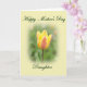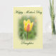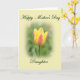 This card features a single yellow flower rising from a softly blurred garden background, like a gentle gift offered with care ❤️. The petals glow in sunny yellow with vertical strokes of red and orange, giving the bloom a tender, almost affectionate presence. A slim green stem holds it steady, set against a wash of leafy greens that feels calm and close, like someone standing nearby to admire it. A creamy pale-yellow border frames the scene, keeping the focus on the flower while adding a warm, springlike glow 🌼. Near the top, the words “Happy Mother’s Day” appear in deep green lettering, centered above the bloom. Near the bottom, the word “Daughter” is placed in matching deep green, set below the flower to feel like a quiet signature. Soft light across the petals and background adds a cozy, caring tone, as if the flower is leaning forward in appreciation. The flower sits centered within the pale-yellow border, with green text above and below against the softly mottled green backdrop.