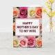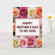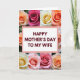 This card features a white rectangular panel centered on the front, edged with a soft pink outline, and it carries the message “HAPPY MOTHER’S DAY TO MY WIFE” in deep red letters. The words sit neatly in the middle, giving the layout a steady focal point while the surrounding flowers add a gentle, romantic closeness ❤️. Around the panel, large roses fill the background in tight, close-up views, as if you’re leaning in to admire them together. The petals show layered curls and velvety folds in peach, creamy yellow, blush pink, and deeper pink tones, with soft lighting that makes the edges look tender and inviting. The contrast between the straight-edged panel and the flowing petals creates a sweet balance, like a calm note set inside a bouquet meant for someone special. The overall look suggests a partner’s affection through the way the flowers seem to cradle the message, like an embrace 🌼. The text appears centered within the pink-outlined white panel, surrounded on all sides by fully opened roses in warm pastel shades.