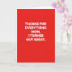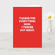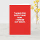 This card features a rich red background with large white lettering centered in the middle, creating a strong contrast that feels like a warm hug ❤️. The message reads, “THANKS FOR EVERYTHING MOM. I TURNED OUT GREAT,” arranged in stacked lines so the words fill most of the front. The type is a simple, thick style with straight edges, giving it a confident, grown-up look. A faint shadow under the letters adds a small lift, like the words are gently hovering above the red surface. With no characters or extra illustrations, the design leans on the bold color and the cheeky line to suggest an affectionate, friendly tease between a child and mom. The text stays in bright white while the background remains solid red from edge to edge, making the layout feel focused and direct 🌼. The letters are evenly spaced and aligned down the center, with a subtle darker-red shadow sitting just behind the white text.