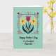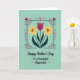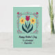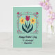 Designed with a calm soft-teal background, this card centers on three stylized flowers that feel lovingly arranged like a small bouquet ❤️. A tall crimson tulip-like bloom stands in the middle, flanked by two golden lily-like flowers whose dark stamens add a gentle, attentive look. Deep forest-green leaves spread outward at the base, grounding the trio as if they’re leaning together in quiet companionship. A thin black rectangular frame encloses the bouquet, giving the design a tidy focal point while the flowers keep it warm and inviting. Outside the frame, ruby-red vines curl and loop into an ornate border, dotted with tiny blossoms and leaves that suggest caring hands reaching around the centerpiece 🌼. Below the artwork, the message “Happy Mother’s Day To a Wonderful Stepmother” sits in flowing dark lettering, centered and easy to read. The contrast between the soft teal field, the black frame, and the red-and-gold florals draws the eye naturally from the bouquet down to the words. The outer border is made of curving red stems with small leaf shapes that trace the edges like a delicate garland.
