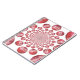 This artwork features a central, spiraling vortex formed by numerous red cricket balls decreasing in size towards a vanishing point. Surrounding this dynamic core are larger, more detailed depictions of red cricket balls, showcasing their textured leather and prominent white stitching from various angles. The entire composition is set against a clean white background, emphasizing the central motif and its details.