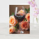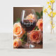 This greeting card features a softly lit still life with a tall, clear wine glass filled with deep red liquid, catching little highlights like a quiet toast ❤️. The glass sits on a warm wooden tabletop where the grain shows through, adding a cozy, intimate setting. Around the base, several roses in peach and apricot tones spill outward, their petals suggesting the kind of gentle attention shared between close friends or partners. Some blossoms are sharply detailed while others fade into a smooth blur in the background, giving the scene a tender, dreamy depth. White lettering is placed across the front of the glass, centered and easy to read against the darker drink. The overall palette balances warm pastels with the rich red in the glass, and the soft lighting makes the petals look velvety and calm 🌼. A faint reflection runs along the stem and bowl, and the roses cluster most densely at the lower left edge of the composition.