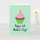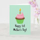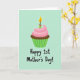 This Mother's Day card features a simple digital illustration set on a solid pastel green background that feels calm and caring ❤️. Centered in the upper half is a single cupcake with a dark brown cake base and a green wrapper decorated with narrow vertical stripes. On top sits a soft pink frosting swirl, sprinkled with tiny dots in mixed colors that add a festive, friendly touch. Rising from the frosting is a slim green candle with diagonal pink and yellow bands, like a small celebration shared close together. Beneath the cupcake, the message “Happy 1st Mother’s Day!” appears across the lower portion in black lettering, standing out clearly against the green. The layout leaves comfortable open space around the main image, giving the design a gentle, affectionate feel 🌼. The candle’s flame is a bright yellow-orange teardrop shape above the striped candle.