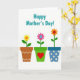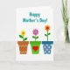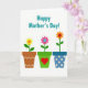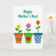 This card features a white background with the phrase “Happy Mother’s Day!” centered near the top in teal lettering. Beneath the text, three small plant pots sit in a neat row like a friendly garden border, adding a cozy, caring mood ❤️. The left pot is earthy brown with a white zigzag pattern and holds a yellow flower with an orange, heart-shaped center. The middle pot is bright green with a red heart on its front, and a pink flower rises from it with a calm blue center, suggesting a tender, affectionate touch. The right pot is deep blue with cream polka dots and supports an orange flower marked with a small red heart, like a quiet sign of closeness 🌼. All three flowers share simple green stems and leaves, keeping the scene easy to take in. The trio of pots is evenly spaced along the lower portion of the design, with the patterns and heart shapes clearly visible against the plain white space.
