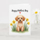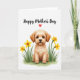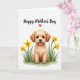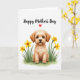 This card features a fluffy, light-colored dog in warm caramel and creamy beige tones, sitting calmly with big dark eyes that meet yours with a tender, friendly gaze ❤️. Around the pup, trumpet-shaped yellow flowers with orange centers lean inward as if gathered close in a gentle hug, supported by soft green leaves painted with a watery texture. The quiet white background leaves plenty of open space, making the dog and flowers feel like the center of attention in a cozy, affectionate moment. Near the top, a short message is placed in flowing hand-lettered text, set in a dark shade that stands out clearly against the white. A small red heart sits beside the words, adding a simple romantic note without crowding the design 🌼. The greenery forms a low border along the bottom, grounding the scene like a little garden patch at the dog’s feet. One small yellow petal rests just beside the pup’s paw, slightly angled on the white space.