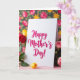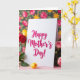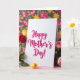 This card shows a white folded greeting card set at a slight angle on a blush-pink surface, surrounded by fresh flowers that lean in as if keeping it company ❤️. Across the front, the message “Happy Mother’s Day!” sits centered in raised fuchsia lettering, standing out against the bright white background. To the left, a deep red rose opens toward the card beside a small yellow bud, with green leaves curving forward like an affectionate gesture. On the right, soft pink rosebuds cluster close, their gentle tones echoing the fuchsia words and adding a tender, caring mood 🌼. Behind everything, the backdrop fades into a soft-focus floral pattern with fuchsia rose shapes and golden starburst accents over a deep, muted green. The lighting is diffused and luminous, catching the edges of petals and the card’s smooth surface without harsh shadows. The background pattern includes scattered golden starbursts nestled among blurred fuchsia blooms on dark green.
