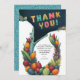 This thank you card has a cute alligator crocodile with a big open mouth and a colorful tropical frame made of fruits and green leaves.