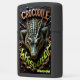 This captivating image showcases a custom, matte black rectangular case featuring a powerfully textured and dark graphic. The artwork centers on a fearsome crocodile emerging from a heavily textured, dark, swirling environment, its head and armored back facing forward. The creature's eyes glow with an intense, fiery orange. The entire scene is surrounded by a dense, organic-looking border of dark, carved elements, giving it a menacing, sculptural depth. The word "CROCODILE" is displayed at the top in dark gold. Below the creature, "Whisperer" is scripted in vibrant lime green, surrounded by a swirling brown texture, followed by the name "Alexander" in smaller gold text. This bold and dark depiction makes for a striking and artistic collectible item.