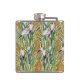 Flask featuring botanical floral pattern, elaborated from hand drawn life sketch. Beautiful spring flowers - white crocuses with fresh green leaves on golden brown background, white dots splattering around them.