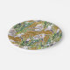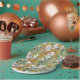 Paper plate featuring botanical floral pattern, elaborated from hand drawn life sketch. Beautiful spring flowers - white crocuses with fresh green leaves on golden brown background, white dots splattering around them.